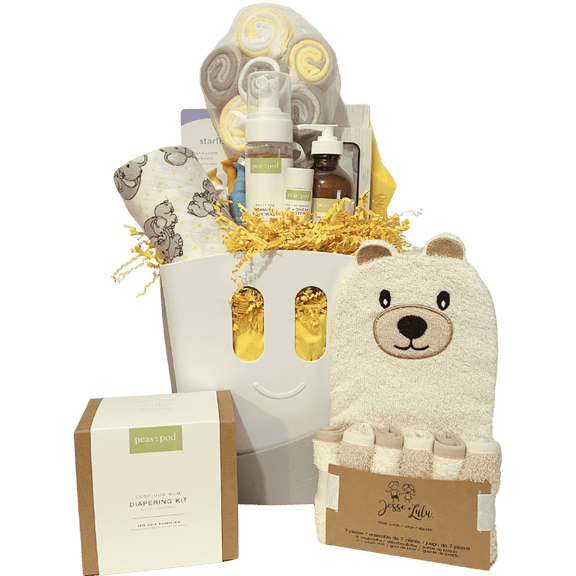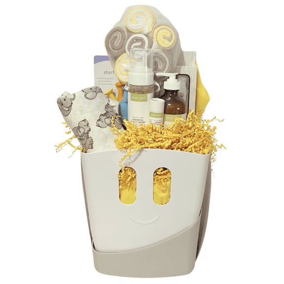 Make baby the star of bath time with The Little Dipper Baby Bath Time Gift Basket, a thoughtful and soothing gift designed to turn everyday routines into moments of comfort and joy. Featuring gentle, locally made bath essentials and soft cotton comforts, this basket pampers baby’s delicate skin while delighting new parents. Beautifully presented in a reusable bath toy drying bin, it is both practical and irresistibly charming. Available wrapped in yellow/orange, pink or blue for a personalized touch that shines as bright as their little dipper.